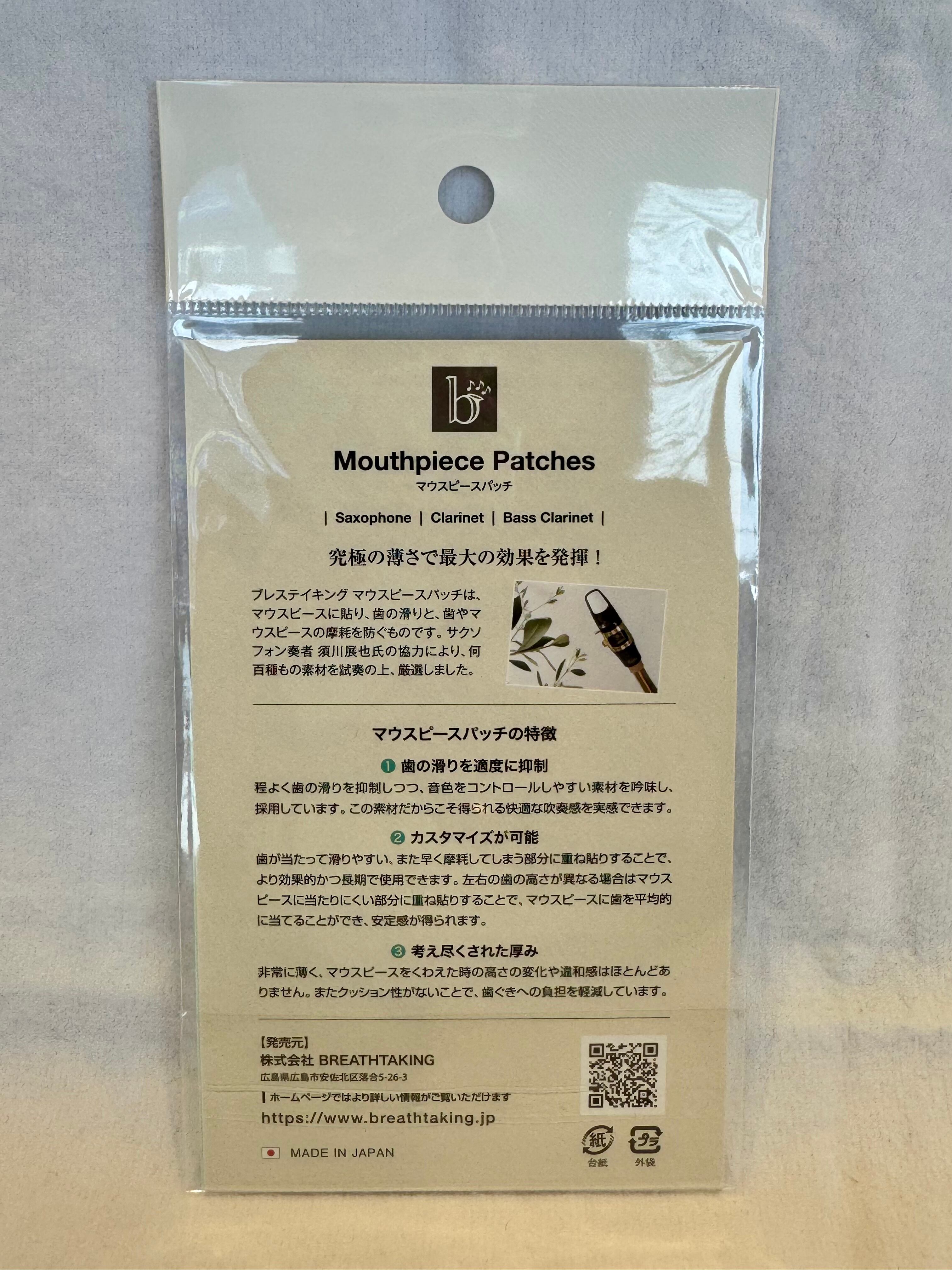 プロサックス奏者須川展也氏の協力を得て何百種類もの素材から厳選し、製作されたというブレステイキングのマウスピースパッチです! マウスピースの歯が当たりにくい部分やよく摩耗してしまう部分に重ね貼りすることで、安定感が得られ、マウスピースが長持ちします♪ マウスピースをくわえたときの高さの変化はほとんどなく、吹奏感にこだわった商品です。